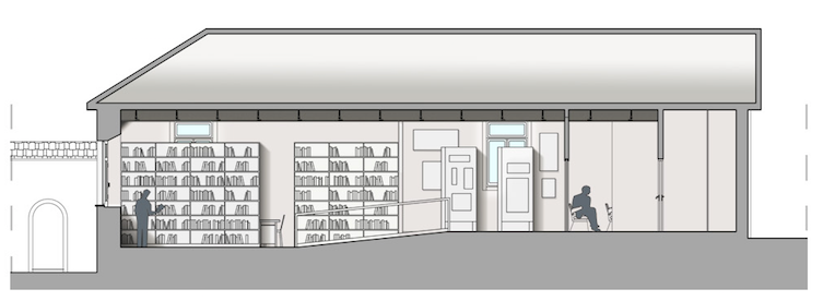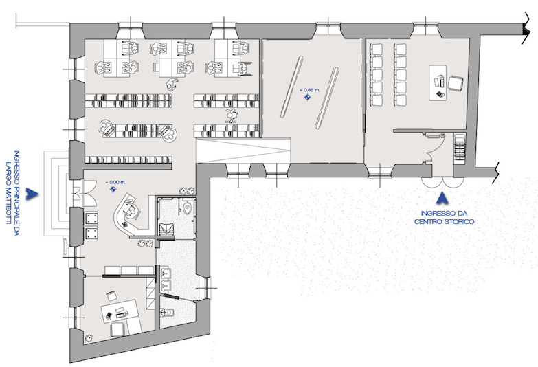 Accedendo alla struttura da largo Matteotti si avrà una zona d’accoglienza, i servizi e l’ufficio del responsabile della struttura. Proseguendo all’interno verrà installata la nuova biblioteca, che attualmente si trova collocata in due piccoli locali del centro storico, dove l’accesso e la vivibilità stessa sono del tutto inadeguati alle normative di sicurezza degli ambienti aperti al pubblico. Una rampa permetterà di superare il dislivello presente e porterà ad un ambiente aperto destinato a museo per accogliere a rotazione una cospicua raccolta di quadri generosamente donata al Comune da un facoltoso benefattore locale.