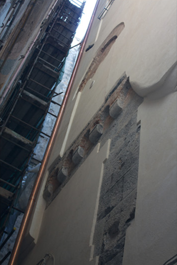 Il progetto prevede la ripulitura accurata delle facciate nei punti in cui è evidente la situazione di incoerenza dell'intonaco con successiva applicazione di intonaco a base calce.